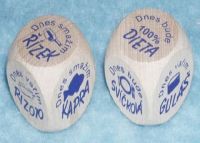 Kostka (30 mm) na které jsou tyto nápisy: Dnes bude svíčková Dnes smažím kapra Dnes smažím řízek Dnes vařím guláš Dnes vařím rizoto Dnes bude 100% dieta