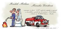 Svatební oznámení – obrázek pár ženich jako hasič a nevěsta s obrázkem hasičské cisterny Tatry.