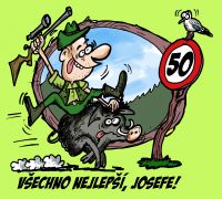 Myslivecké tričko s humorným potiskem – obrázek myslivec na divočákovi, značka omezení rychlosti, sojka…