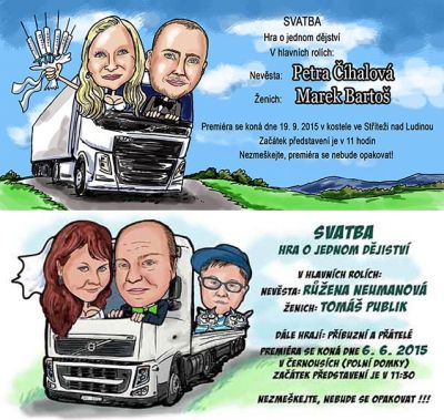 Svatební oznámení – malované karikatury ženich a nevěsta v kamionu dle fotky.