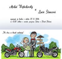 Do Poznámky napište text svatebního oznámení, případně úpravy barvy podkladu, vlasů atd… . Cena grafiky + 90,– připočteme automaticky k ceně v objednávce. V případě složitějších úprav a dodělávek (jiné motorky, postav atd…) cena na domluvě.