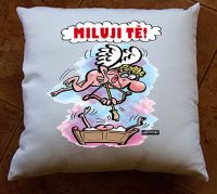 Polštář s humorným obrázkem soulože a nad ním vznášející se Amor, na jehož konci šípu je prezervativ