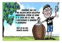 Originální pozvánka k výročí narozenin s obrázkem slivovice a demižonu a oslavence.