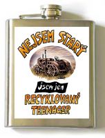 Placatka s krásným legendárním traktorem a nápisem: „NEJSEM STARÝ, JSEM JEN RECYKLOVANÝ TEENAGER“ © design Ivan Křemeček